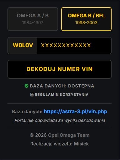 Mam dla Was świetną wiadomość, która ułatwi życie każdemu właścicielowi i przyszłemu nabywcy Omegi. Dzięki nawiązaniu współpracy z serwisem astra-3.pl, uruchomiłem na naszym forum widżet Dekodera VIN. Gdzie go znajdziecie? Widżet znajduje się w panelu bocznym (sidebarze) strony głównej - prawa strona. Jest dostępny dla każdego, kto chce błyskawicznie sprawdzić wyposażenie swojego auta. Wpisujesz ostatnie 12 znaków swojego numeru VIN (początek W0L0V uzupełniłem za Ciebie). Klikasz DEKODUJ NUMER VIN. Zostajesz przeniesiony bezpośrednio do szczegółowej listy wyposażenia Twojego egzemplarza na stronie partnera. Współpraca i rozwój bazy Dekoder bazuje na ogromnej bazie danych projektu astra-3.pl. Co ważne – administrator bazy zadeklarował chęć optymalizacji wyników pod kątem modelu Omega! Jeśli zauważycie, że dekoder nie rozpoznaje jakiegoś elementu wyposażenia Waszej Omegi (pojawia się kod RPO bez opisu), proszę o informację w wiadomości prywatnej. Będę zbierać te dane i przekazywać je do aktualizacji Ważne info: Widżet posiada dynamiczny status połączenia – zawsze widzicie, czy baza danych https://astra-3.pl/vin.php jest w danej chwili dostępna. Korzystanie z dekodera jest oczywiście całkowicie bezpłatne. Zapraszam do sprawdzania swoich maszyn Pozdrawiam Wasz wszędobylski admin