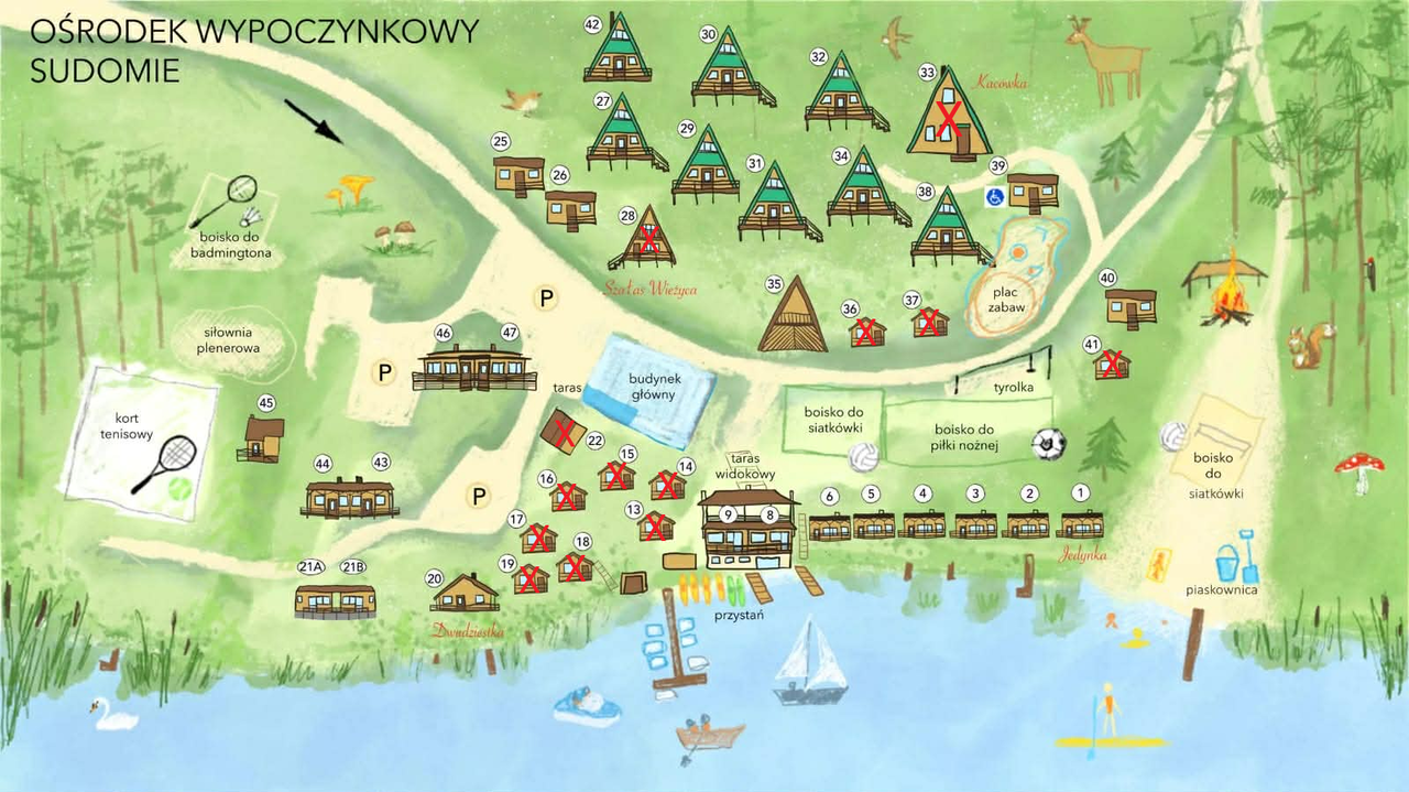 Regulamin ośrodka wypoczynkowego "SUDOMIE" ( źródło: https://sudomie.eu/regulamin-ow-sudomie ) I Postanowienia Ogólne. Ośrodek Wypoczynkowy Sudomie zwany dalej Ośrodkiem, jest położony nad jeziorem Sudomie i jest otoczony lasami. Ośrodek świadczy usługi krótkotrwałego zakwaterowania i jest czynny przez cały rok, z wyłączeniem okresu od Nowego Roku do połowy kwietnia. W okresie od połowy października do końca roku do dyspozycji pozostają domki posiadające ogrzewanie kominkowe, z wyłączeniem okresów szczególnie niskich temperatur bądź nadmiernych opadów śniegu uniemożliwiających komunikację. Ośrodek oferuje wyżywienie w trakcie turnusów wakacyjnych oraz dla grup zorganizowanych w miesiącach maj, czerwiec i wrzesień. Doba hotelowa rozpoczyna się w dniu przyjazdu o godzinie 18.00 a kończy w dniu wyjazdu o godzinie 10.00. Po przyjeździe do Ośrodka należy okazać ważny dokument tożsamości, celem dokonania przez administrację Ośrodka formalności związanych z pobytem w Ośrodku. II Uprawnienie do korzystania z usług Ośrodka. Do korzystania z usług Ośrodka upoważnia dokonana wcześniej rezerwacja z wniesioną na jej potwierdzenie gwarancją, zgodnie z ustalonymi warunkami rezerwacji, oraz uregulowanie różnicy pomiędzy kwotą gwarancji, a pełną należnością za planowany pobyt. Warunki rezerwacji, wpłacania gwarancji i jej zwrotu oraz skutków tych czynności w odniesieniu do ochrony danych osobowych, określone są w Zasadach Rezerwacji, wpłacania gwarancji oraz ponoszenia opłat za korzystanie z usług w Ośrodku Wypoczynkowym Sudomie” – zał. nr 1. Cena pobytu w Ośrodku nie uwzględnia opłaty miejscowej pobieranej przy czynnościach meldunkowych, a przekazywanej na konto Gminy. III Udostępnienie i zdanie domku. Wykonanie usługi polega na przekazaniu czystego domku gotowego do użytkowania i następuje poprzez przekazanie jednego kompletu kluczy oraz informacji o wyposażeniu domku i stanu technicznego pomieszczeń – w obecności przedstawiciela Ośrodka. Oddanie domku w dniu wyjazdu, następuje na zasadach stosowanych przy obejmowaniu domku. IV Odpowiedzialność osób korzystających z Ośrodka. Za uszkodzone lub zagubione przedmioty oddane do użytkowania oraz za szkody wynikające z nieprawidłowej eksploatacji wyposażenia domku, bądź też sprzętu należącego do Ośrodka odpowiedzialność ponoszą osoby korzystające z domku. Ośrodek nie ponosi odpowiedzialności za przedmioty wartościowe oraz wartości pieniężne pozostawione w domku lub w innych miejscach Ośrodka. V Zasady porządkowe związane z korzystaniem z Ośrodka. Na terenie Ośrodka obowiązuje cisza nocna w godzinach od 22.00 do 7.00 rano, z wyjątkiem imprez organizowanych przez Ośrodek, wcześniej zapowiedzianych i ogłoszonych. Na terenie Ośrodka zabronione jest zakłócanie spokoju m. in. poprzez wykonywanie bądź odtwarzanie głośnej muzyki, bez zgody Ośrodka (lub w czasie ciszy nocnej). Na terenie Ośrodka obowiązuje zakaz jazdy quadami oraz głośnymi jednośladami. Jezioro Sudomie stanowi strefę ciszy. Osoby niebędące gośćmi Ośrodka mogą przebywać na jego terenie wyłącznie za uprzednią zgodą administracji Ośrodka i w czasie przez niego ustalonym. VI Wjazd i parkowanie pojazdów. Wjazd i parkowanie na terenie Ośrodka dozwolone jest wyłącznie w miejscu wyznaczonym do tego celu i wskazanym przez personel Ośrodka. Parking jest niestrzeżony, a Ośrodek nie odpowiada za jakiekolwiek szkody w parkowanym pojeździe, spowodowane przez osoby trzecie lub siły natury (np. wiatr, burza, woda, ogień). Do jednego domku przypisane jest jedno miejsce parkingowe. Parking jest bezpłatny wyłącznie dla klientów Ośrodka. VII Pozostałe sprawy porządkowe. Pobyt w Ośrodku dla dzieci i młodzieży do lat 18 dozwolony jest jedynie pod opieką dorosłych. Ośrodek nie odpowiada za niedogodności spowodowane przyczynami od niego niezależnymi, np. przerwami w dostawie prądu, do czasu włączenia się agregatu prądotwórczego. Zabronione jest korzystanie w domkach z własnych urządzeń elektrycznych, butli gazowych itp. oraz wykorzystywania energii elektrycznej Ośrodka do ładowania akumulatorów samochodowych. Zabronione jest korzystanie z grilla na tarasie domku, rozpalanie ogniska poza miejscami do tego celu wskazanymi, bądź też w okresach objętych zakazami z przyczyn ochrony przeciw pożarowej, nadto używania środków pirotechnicznych, lampionów, petard itp. Wymagane jest uzyskanie zgody administracji Ośrodka na rozpalanie ogniska w miejscu do tego przewidzianym. Na terenie całego Ośrodka obowiązuje zakaz palenia tytoniu, poza miejscami do tego wyznaczonymi – całkowity zakaz palenia obowiązuje w wypadku wprowadzenia takiego zakazu w lasach okalających teren Ośrodka. Śmieci i odpady winny być składowane w przeznaczonych do tego pojemnikach, z zachowaniem obowiązku ich segregacji. Goście Ośrodka, wypoczywający wraz z ich zwierzętami zobowiązani są do usuwania odchodów tych zwierząt. VIII Ochrona Danych Osobowych (RODO). Udostępnione Ośrodkowi przez osoby korzystające dane osobowe wykorzystywane być mogą wyłącznie dla celów związanych z pobytem tych osób w Ośrodku. Administratorem danych osobowych osób korzystających z Ośrodka jest jego właściciel, to jest SSP Techno-Service Sp. z o.o. z siedzibą w Gdańsku. Podmiotem przetwarzającym dane, o których mowa w pkt. 2 powyżej, jest właściciel Ośrodka. Szczegółowe zasady dot. ochrony i przetwarzania danych osobowych określone są w „Polityce Prywatności” stanowiącej załącznik nr 2 do niniejszego regulaminu. Właściciele i zarządca Ośrodka Wypoczynkowego Sudomie SSP Techno-Service Sp. z o.o. tel. +48 58 341 98 02.